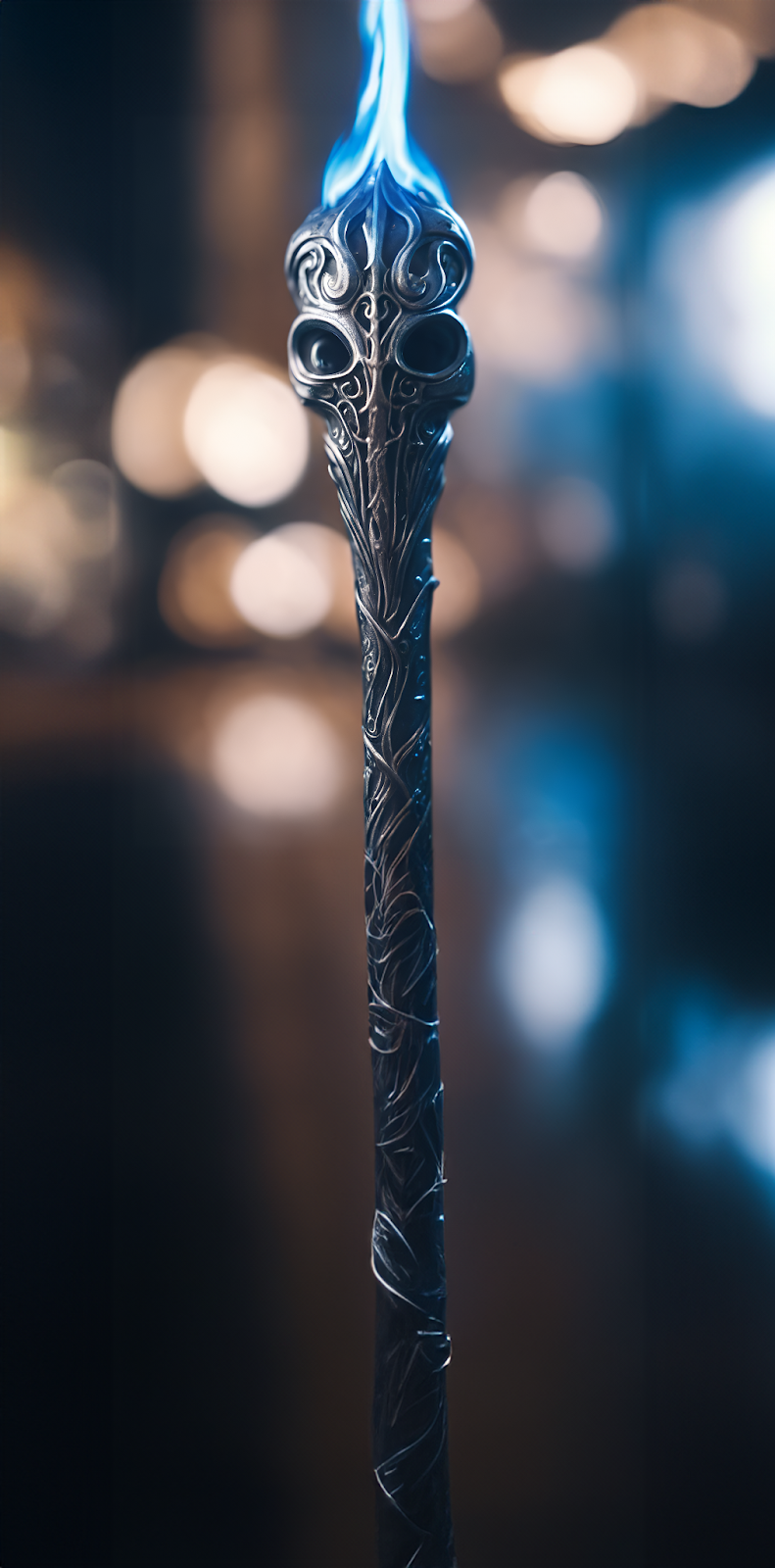 The Mindscorcher is an intricately designed platinum staff. Its surface adorned with alien runes that seem to writhe and pulse with an otherworldly energy. Fae Fyre glows continuously from its head.