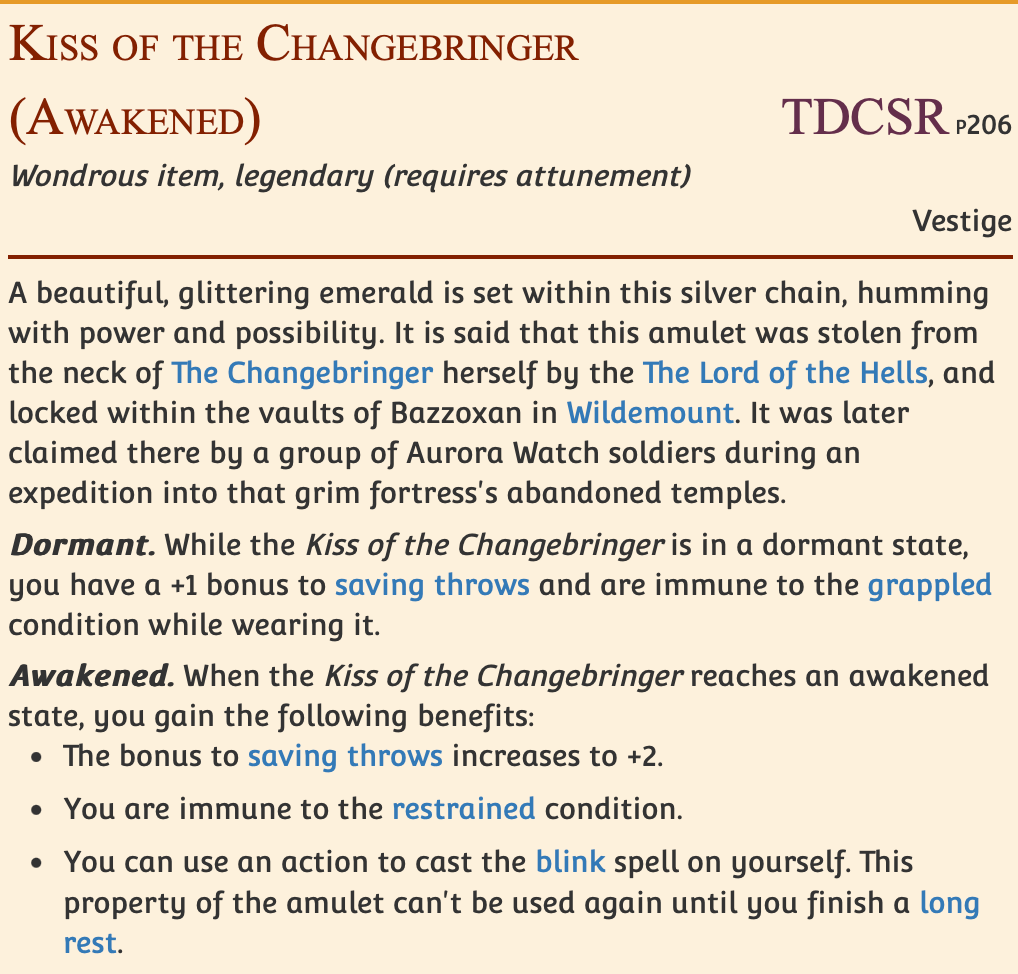 During the long rest the group takes, two things happen that night. The Dowager Queen gives True Queen Cass, in lieu of a real crown, something for a material plane traveler: another collar, featuring a beautiful, glittering emerald set within the silver chain, humming with power and possibility. This magical item, called Kiss of the Changebringer, is awakened. A Vestige of Divergence that belonged to the Changebringer.